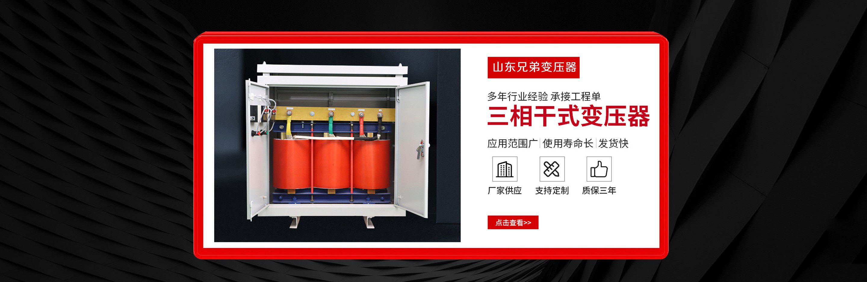 山東兄弟變壓器有限公司經營SCB10干式變壓器,SCB11干式變壓器價格,SCB12變壓器,SCB13干式變壓器,SCB14干式變壓器,SCB18干式變壓器等產品及用戶要求的特殊變壓器。 公司的質量方針是:“顧客的滿意,是我公司的追求。”堅持質量,用戶至上,以質興業,以優取勝,愿為廣大用戶設計各種要求的變壓器,以求共同發展。 企業精神:“創新、求實、誠信、高效”。 企業作風:“嚴、細、實、快”。 企業工作方針:“加強內部管理,夯實基礎,全面提高職工整體素質,使企業管理水平再上新的臺階”。 公...